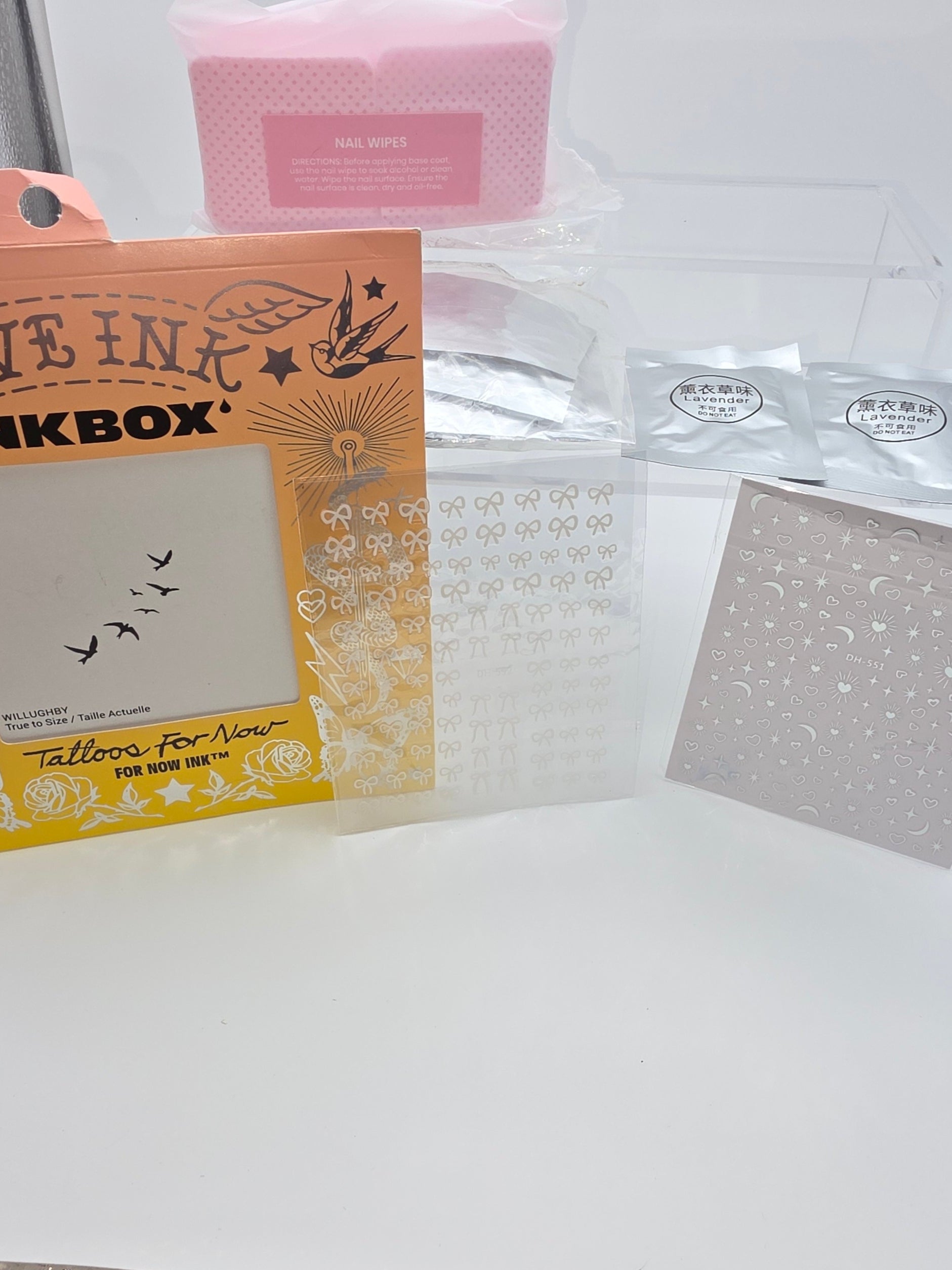 Brighten your style with this playful assortment featuring eye-catching nail art, trendy Inkbox temporary tattoos, handy nail wipes, and calming lavender foil packets. Perfect for mixing and matching, this set lets you create fun, fresh looks that stand out wherever you go!