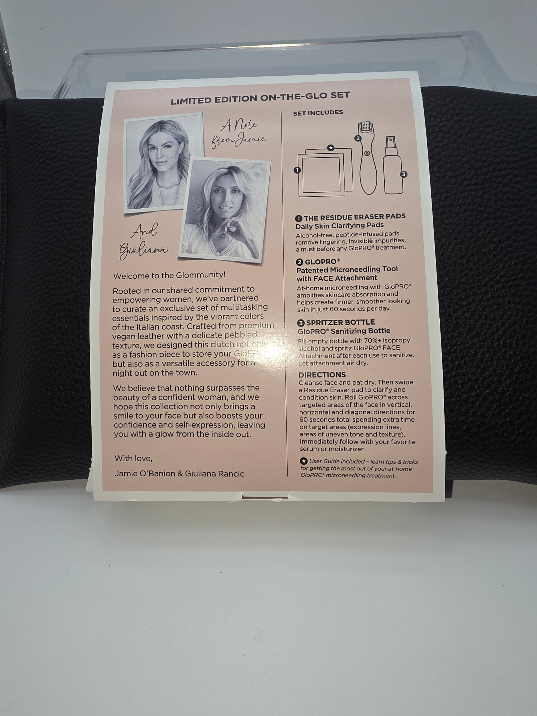 BeautyBio × By Giuliana “On‑The‑Glo” Limited Edition Set featuring the GloPRO™ microneedling tool in a stylish travel clutch. It includes: