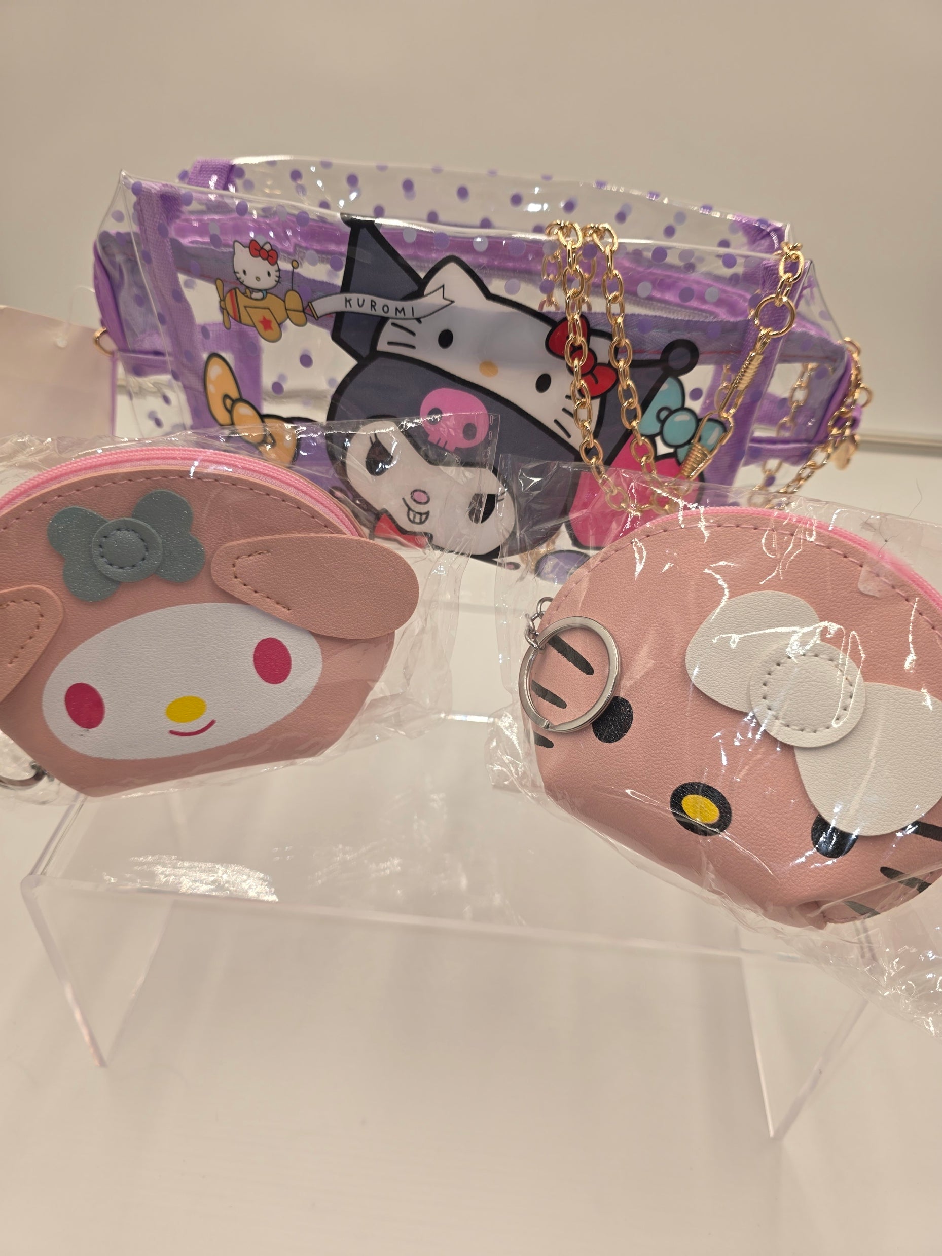Add a touch of kawaii charm to your collection with this playful bundle featuring a Kuromi clear pouch with a chic gold chain, a sweet My Melody coin pouch, and an adorable Hello Kitty coin pouch. Perfect for keeping your essentials organized in style, these pouches bring fun and functionality together for everyday use or gifting.