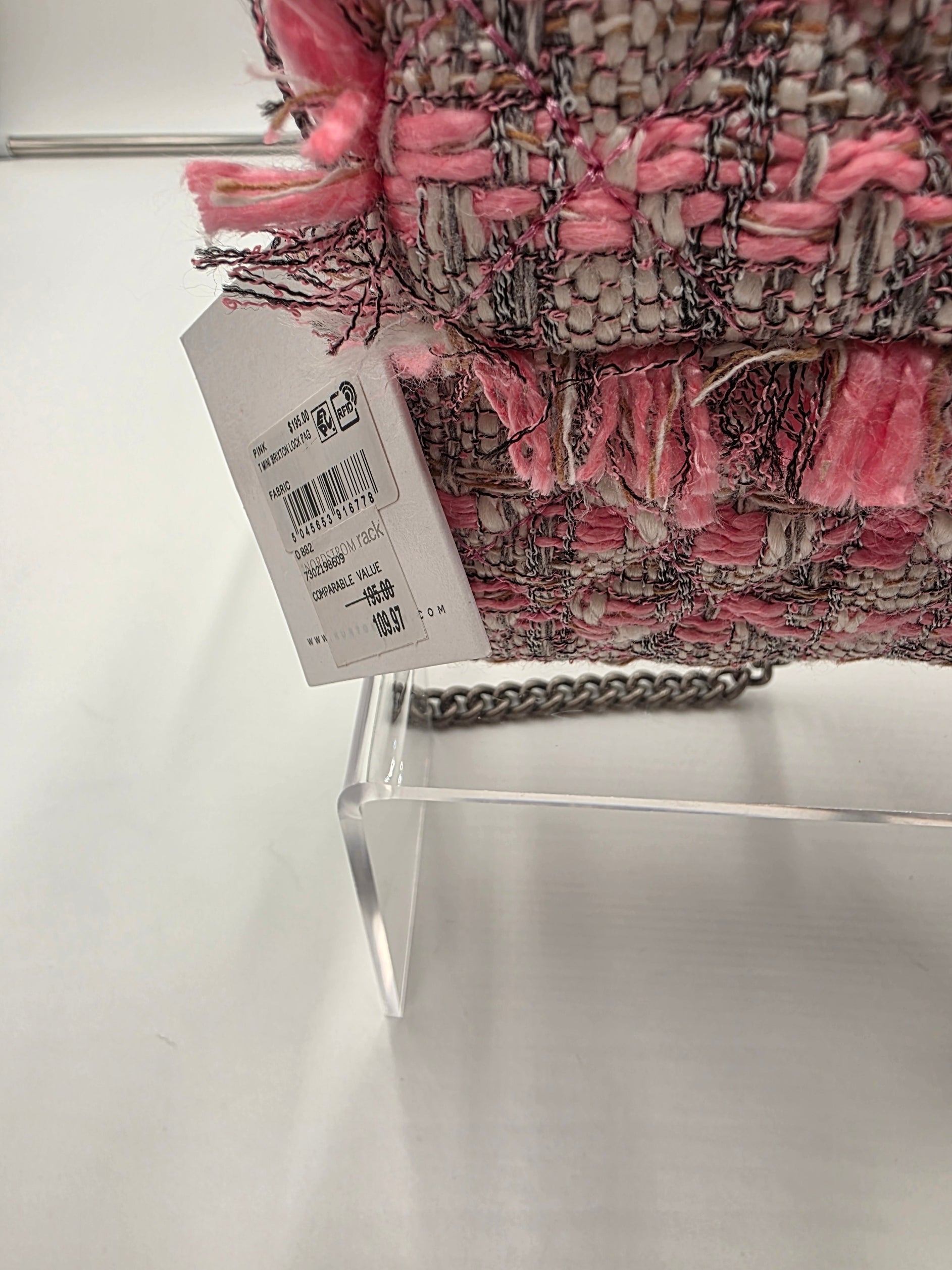 Elevate your ensemble with theKurt Geiger London Tweed Mini Brixton Lock Shoulder Bag. Crafted with refined tweed fabric and accented by elegant brass hardware, this compact bag features a distinctive lock closure and a brass chain shoulder strap for a polished finish. It arrives new with tags, accompanied by a duster bag and authenticity card, ensuring both style and quality in one sophisticated accessory.