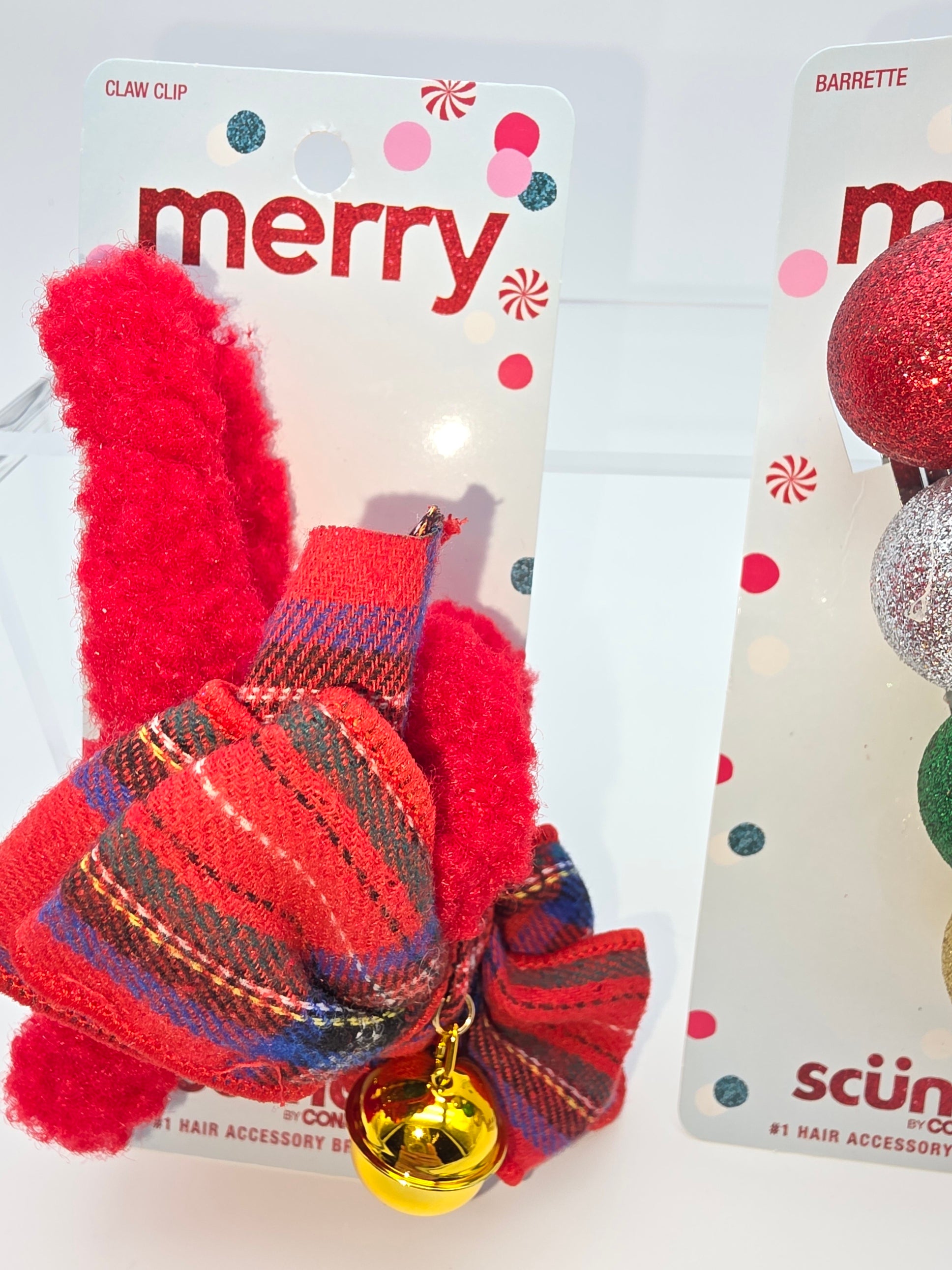 Add a festive touch to your hair with the Scunci by Conair Merry Collection set! This playful duo includes a cozy red fuzzy claw clip perfect for securing your locks with a fun flair, plus a charming decorated barrette to brighten any hairstyle. Both pieces come new with tags, ready to bring holiday cheer to your look.