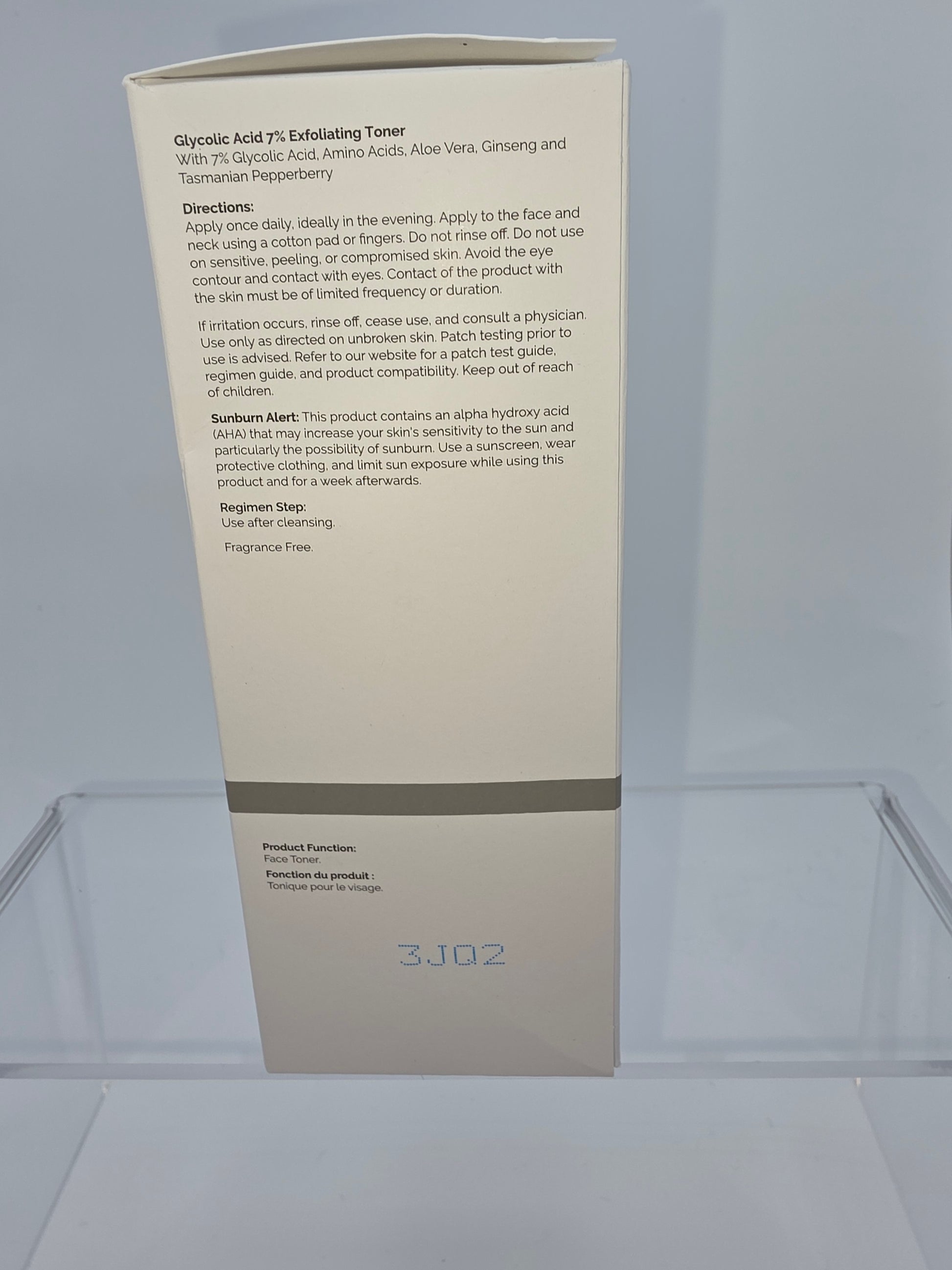 The Ordinary Glycolic Acid 7% Exfoliating Toner is a powerful, water-based formula designed to improve skin clarity, brightness, and texture. Infused with glycolic acid, aloe vera, ginseng, amino acids, and Tasmanian pepperberry extract, this daily exfoliating toner helps remove dead skin cells, smooth uneven texture, and promote a more radiant complexion. With a pH of 3.6, it effectively resurfaces the skin while soothing botanicals help minimize irritation.