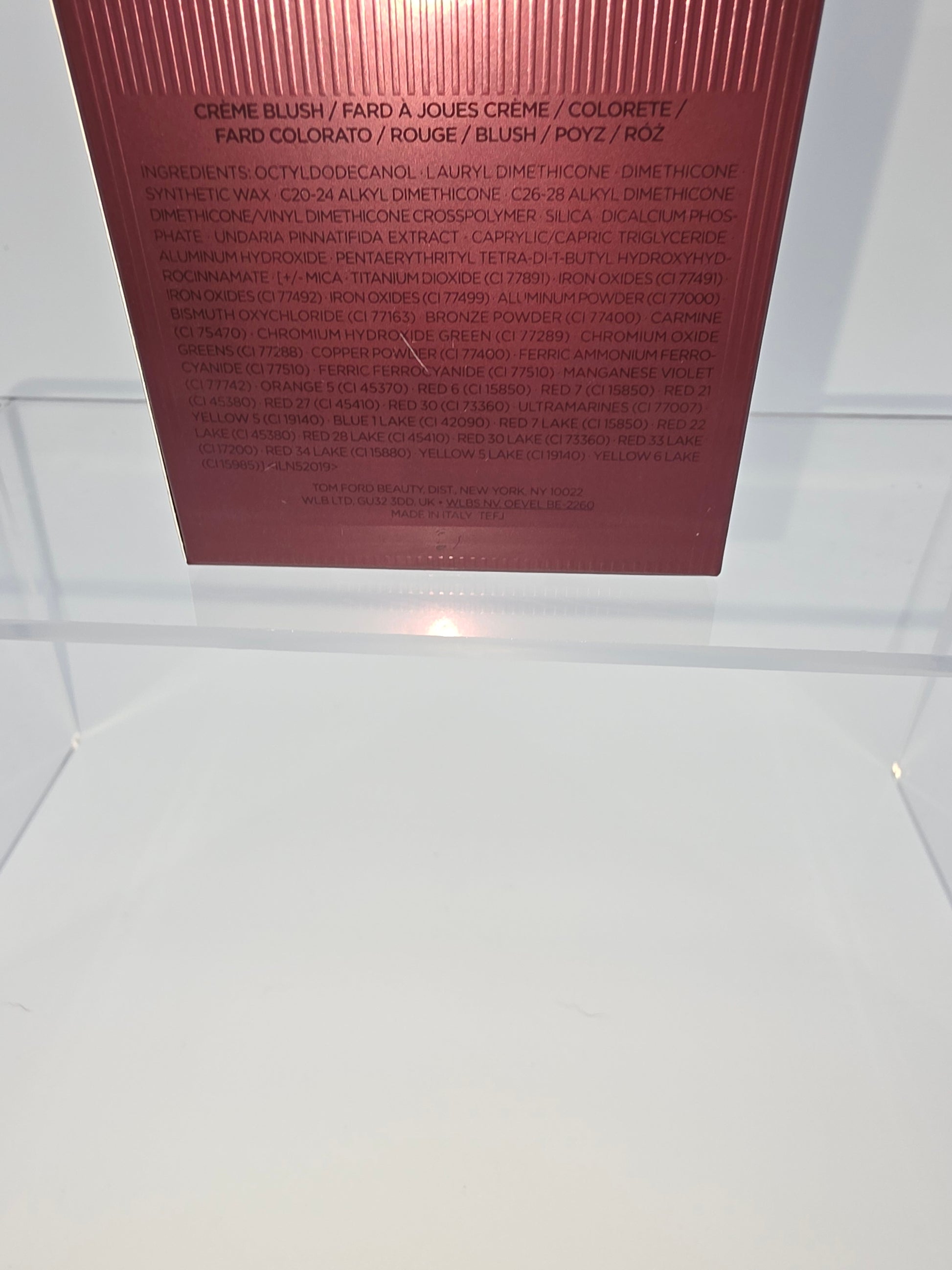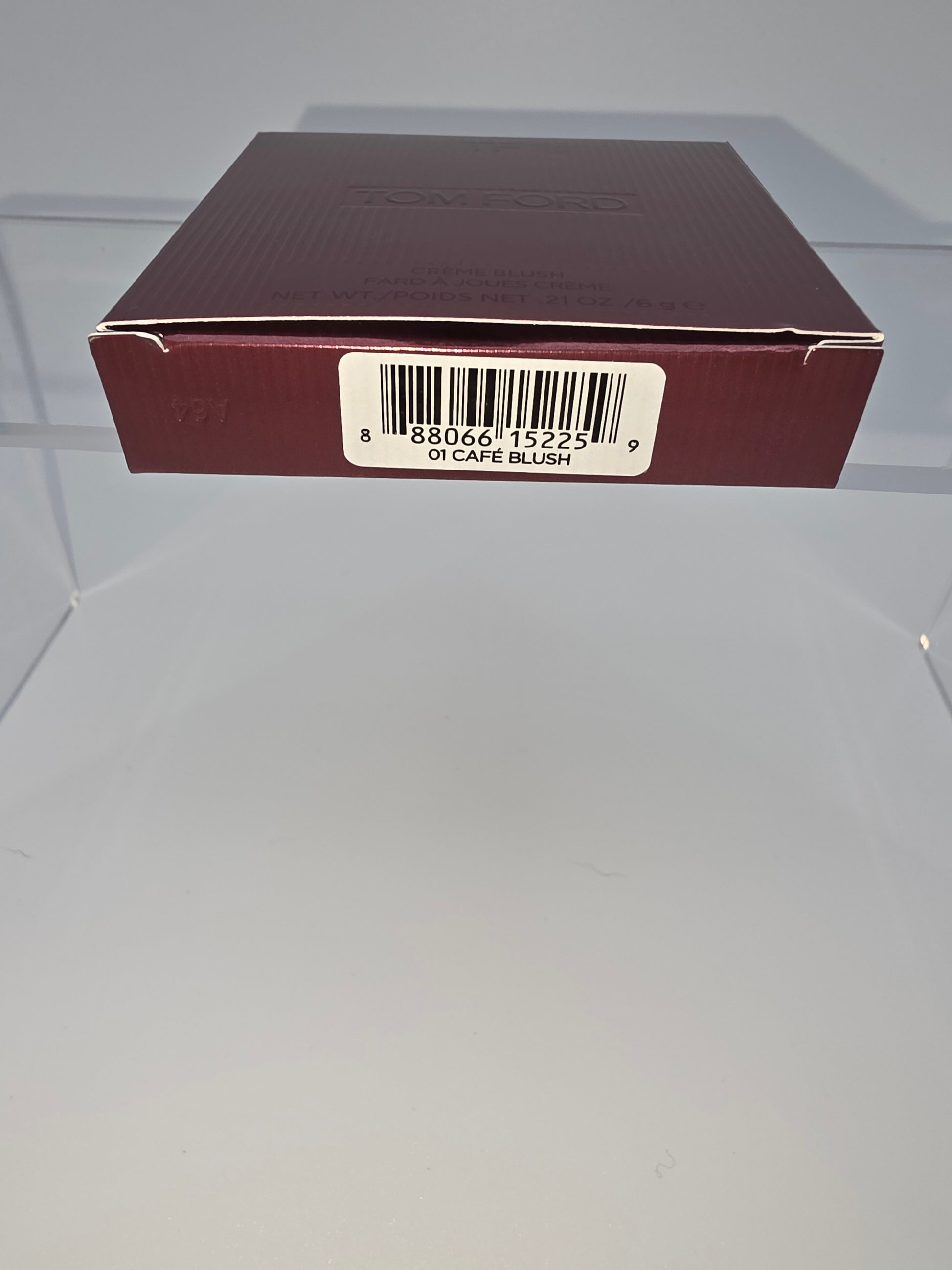 Tom Ford Crème Blush—a luxurious high-pigment cream blush presented in an elegant compact with a mirrored lid. The minimalist packaging in your images, along with the signature ribbed surface and “TF” logo, matches the aesthetic of Tom Ford’s creme formula. In the shade 01 Cafe Blush. New in box with duster bag.